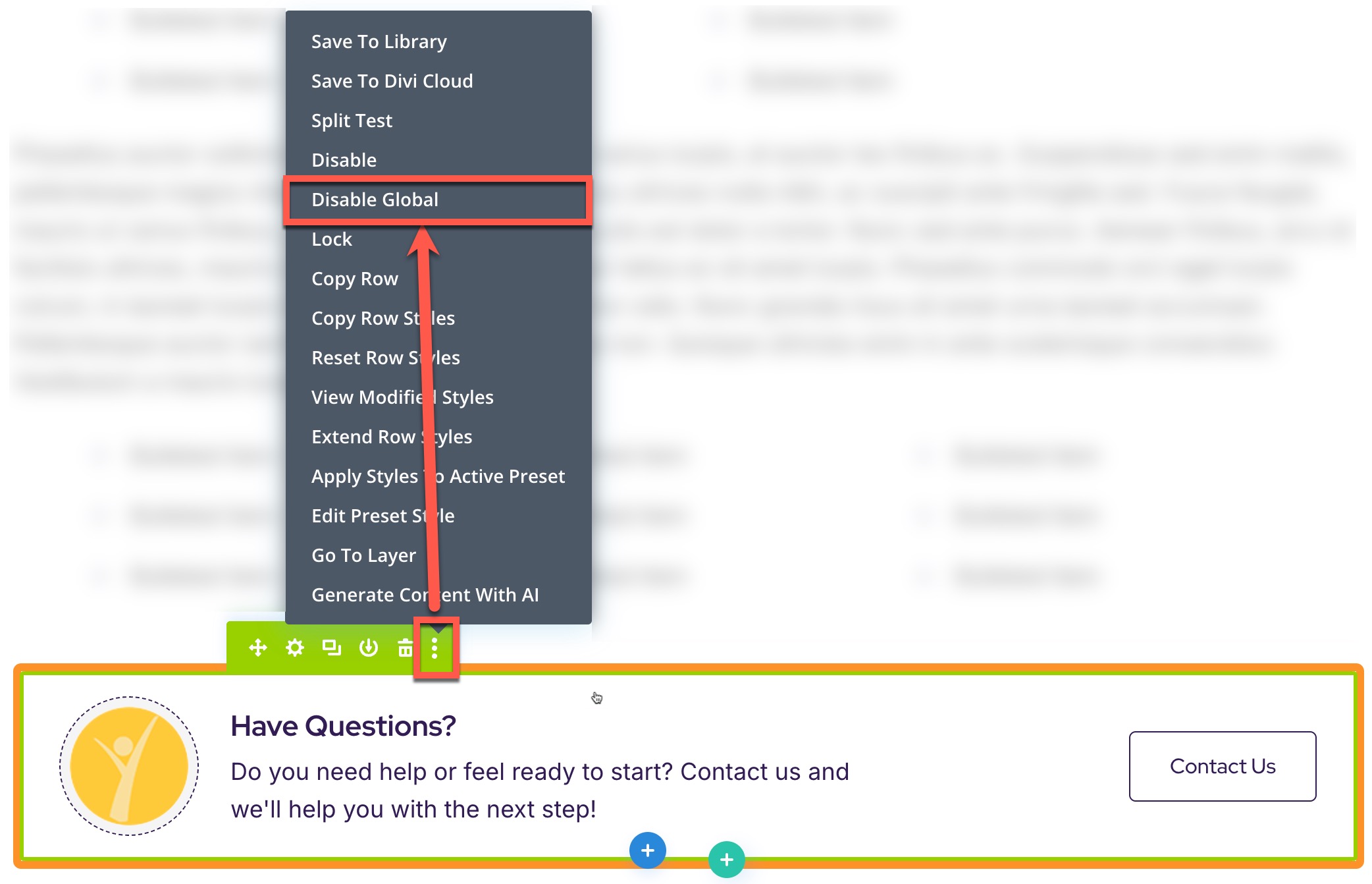 If you’d like to change the call to action row for use just on this page, disable the global setting on the row like this: